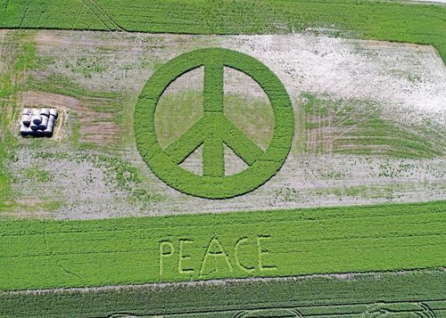 Nu har han gjort det igen. Lantbrukaren Per Larsson i Skåne har åter odlat ett konstverk på sin åker. I år blev det en internationell önskan om fred.