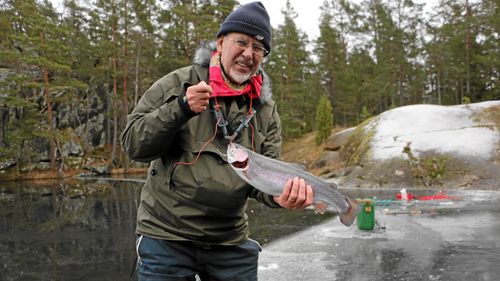 I södra Sverige är is ingen självklarhet. Lands fiskereporter har längtat svårt efter att pimpla regnbåge. Men när han äntligen kom ut tvingades han ta till fikaknepet!