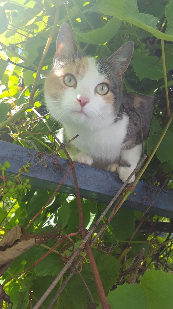 Astrid från Flen har hittat en riktig utkiksplats, uppkrupen bland vinrankorna.