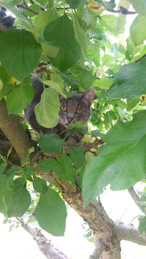 Vig katt med vass blick. Ellen Bengtsson klättrar i ett äppelträd i Sövde.