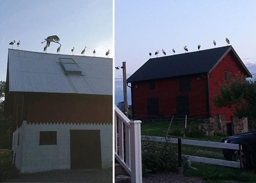 Den massiva storkflocken släpptes nyligen ut i Skåne, men tog en vända förbi Emys hästgård i Östergötland.