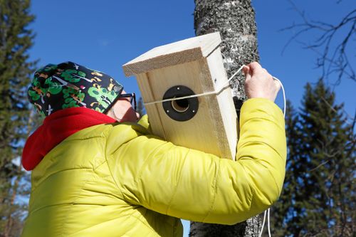 Tänk att ha hela familjen Ekorre som grannar. Här är ett litet ekorrhus att bygga, sätta upp och bjuda in till.