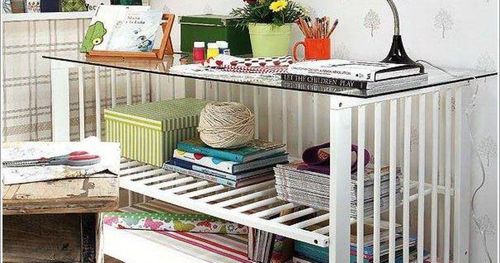 Här har babysängen blivit fullvuxen. En skiva av glas gör den till mammas skrivbord.