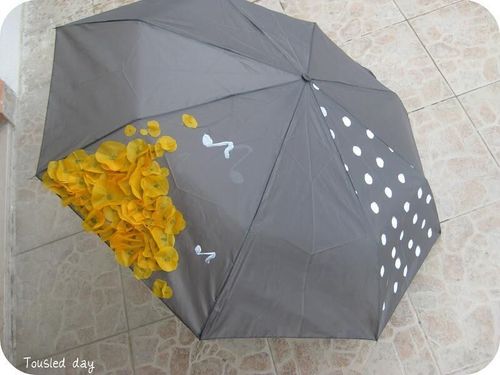 Ett anonymt paraply blir finare och lätt att hitta bland andra paraplyer med hemgjorda dekorationer. Det här har pimpats med ”solar” på ena sidan och regndroppar på den andra.