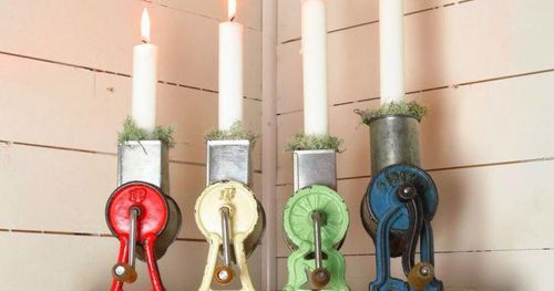 Gamla mandelkvarnar brukar du kunna hitta ganska enkelt på loppisar, placera 4 tillsammans och du har en härligt lantlig adventsljusstake.