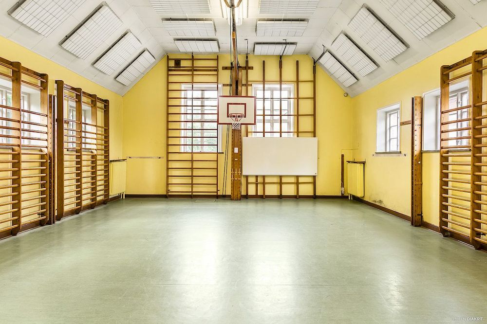Gymnastiksalen är i en egen byggnad på 169 kvadratmeter vid sidan av huvudbyggnaden. Varför inte rusta upp salen till ett hemmagym eller en yogasal?