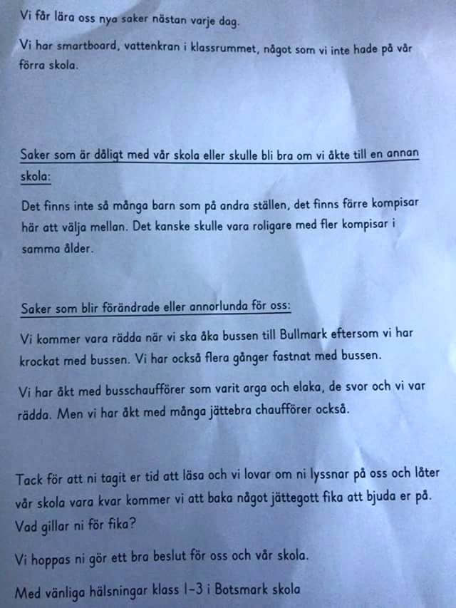 Barnen i Botsmarks skola håller just nu tummarna för att de ska få gå kvar i sin skola. Om den läggs ner måste de åka 9 mil skolskjuts om dagen till en större skola i Sävar. Läs barnens gripande brev till kommunpolitikerna.