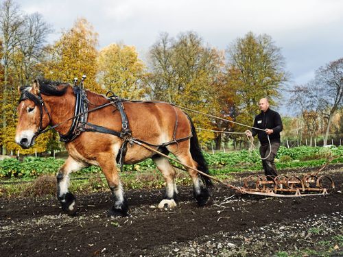 Hans Johansson förenar sina två stora intressen: hästar och grönsaksodling. Land fick vara med när den stora ardennerhästen Parant harvade jorden.