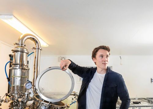 Viktor Björklund, 23 år, driver ett eget destilleri på släktgården på Brändön utanför Luleå. Här gör han norrbottnisk vodka på ekologiskt korn från trakten.