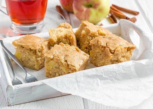 En vit kladdig brownie med en härlig äppelgömma. Baka sensommarens mjuka kaka i långpanna!