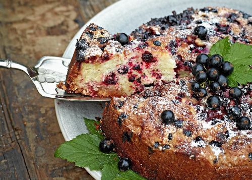 En härligt mjuk och saftig mandelkaka med frisk smak av svarta vinbär. Sensommarens godaste bakverk!