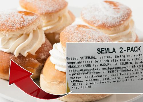 Bakverkets innehållsförteckning är ofta en spännande läsning - kolla noga! Här är semlorna som innehåller både fruktkärnor och palmolja.