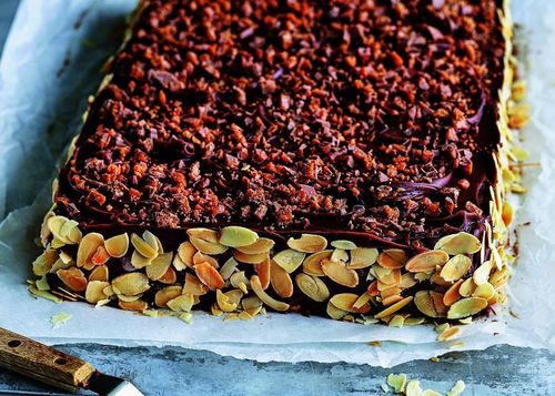 Den här kakan är riktigt god till en kopp kaffe! Nötiga bottnar varvade med smörkräm och toppade med chokladganache och crunchig Daim. Vad kan gå fel?