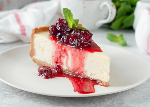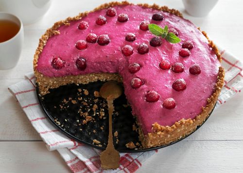 Den klassiska cheesecaken med färskost och digestivebotten får här sällskap av syrligt goda lingon.