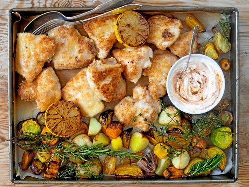 Servera den fasigt ostpanerade kycklingen nystekt med yoghurtsås, ugnsrostade rotsaker och citron att pressa över.