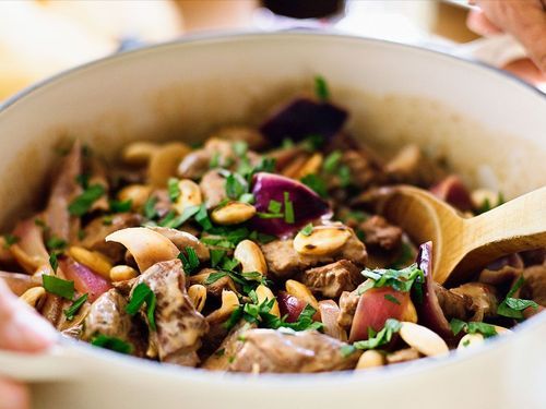 Den här grytan med glöggmarinerad lövbiff är försvinnande god! Den får extra sting av sambal och härligt crunch av smörstekt mandel. En ny julklassiker!