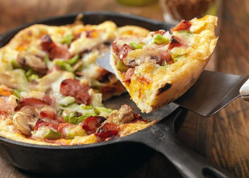Hemligheten bakom denna underbart frasiga panpizza med tjock och fluffig botten är att den bakas i en gjutjärnspanna.