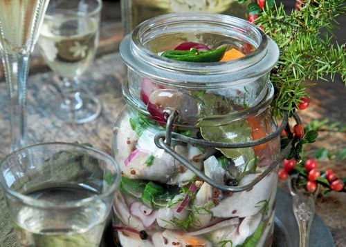 En gravad ansjovisströmming med kapris, purjolök och dill att duka fram till julens buffébord.