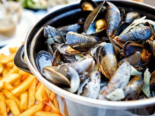 Hackad chili, tre sorters lök och vitt vin ger härliga smaker till detta musselrecept.
