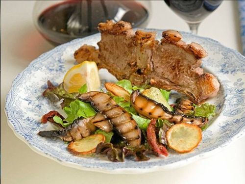 Lammkött och getost är alltid en god kombination. Och till den lite sträva oströran passar sötman från grillade äpplen och sältan från oliver utmärkt.