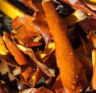 2. Lägg skalstrimlorna i en skål och salta. Rör om och låt skalen stå en stund så att saltet hinner dra ur en del av vätskan.