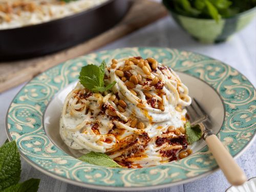 Det här är en krämig pasta utan grädde. Myntan och vitlöken gifter sig perfekt i såsen som har fräsch yoghurt som bas. Pricken över i:et är de krispiga, smörstekta pinjenötterna!