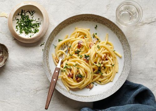 Den krämiga pastafavoriten carbonara med äggulor, vispgrädde, riven hårdost – och knaperstekt halloumi!