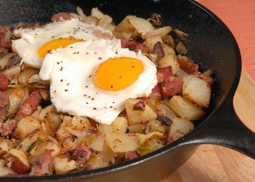 En klassisk pyttipanna består av två till tre sorters kött, stekt potatis och gul lök