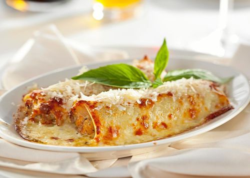 Färska pastaplattor fylls med en krämig kyckling- och skinkröra, och toppas med ostsås Alfredo.