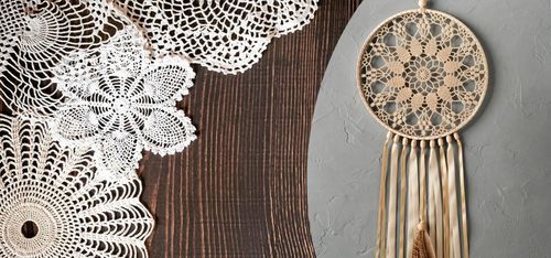 Släng inte gamla, virkade dukar. De kan bli fina drömfångare. Börja med att linda garn runt en ring, till exempel från en gammal broderiram. Sy sedan fast duken inne i ringen. Dekorera, häng upp och skryt.