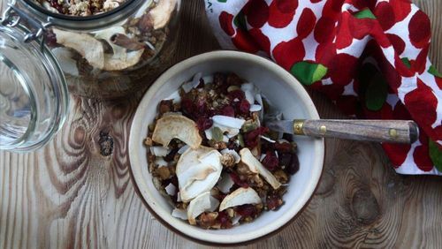 Kanel, kardemumma, kokos och äpple. I den här krispiga granolan samsas julens smaker. Lika bra att du gör en dubbelsats – det kommer behövas.