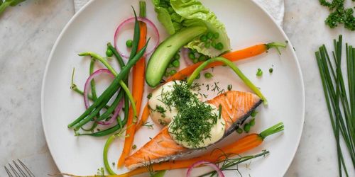 Dill, primörer, färskpotatis och majonnäs. Bjud på en tallrik med stekt inlagd lax i huvudrollen.