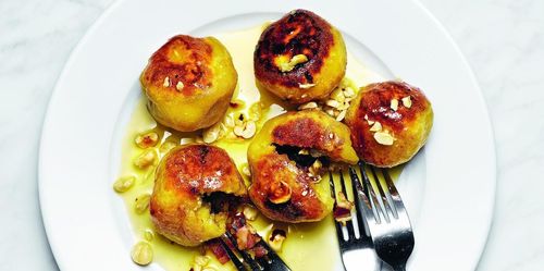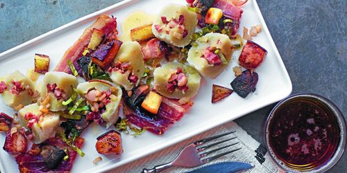 En moderna variant på palt med krispiga chips av rimmat sidfläsk, sauterad svamp och stekt syrligt äpple.