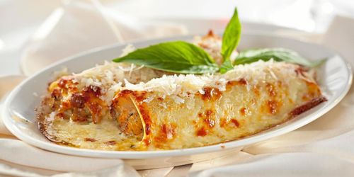 Färska pastaplattor fylls med en krämig kyckling- och skinkröra, och toppas med ostsås Alfredo.